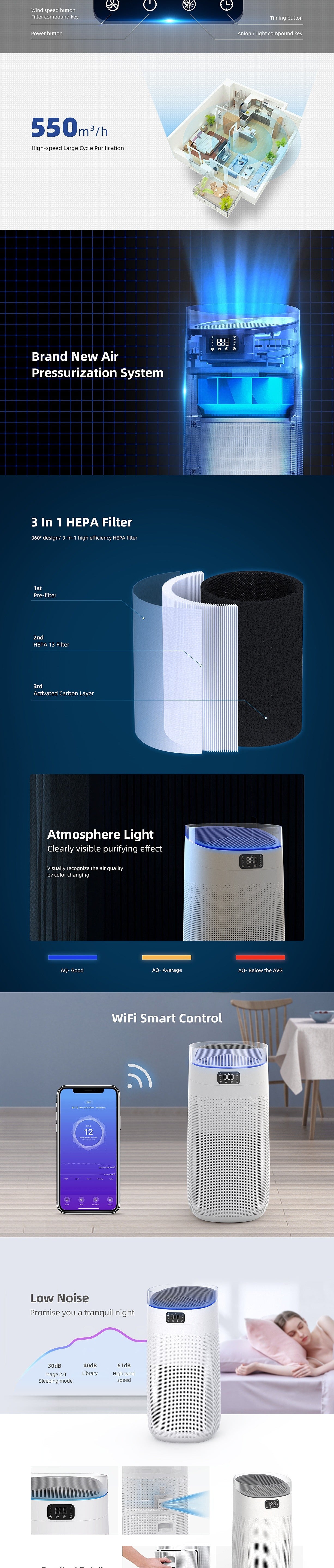 - CADR 550m³/h: Rapid purification, ideal for homes and offices dealing with high air air pollution levels.