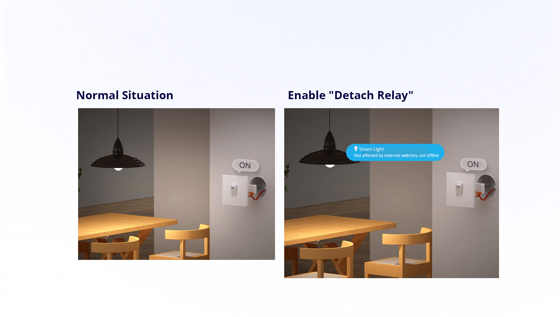 “Detach Relay” means the states of external switches and relay are separated, so operating the external switch button won’t affect relay state. As below, the smart light won’t be offline after enabling “Detach Relay”, and can App control smart lights.