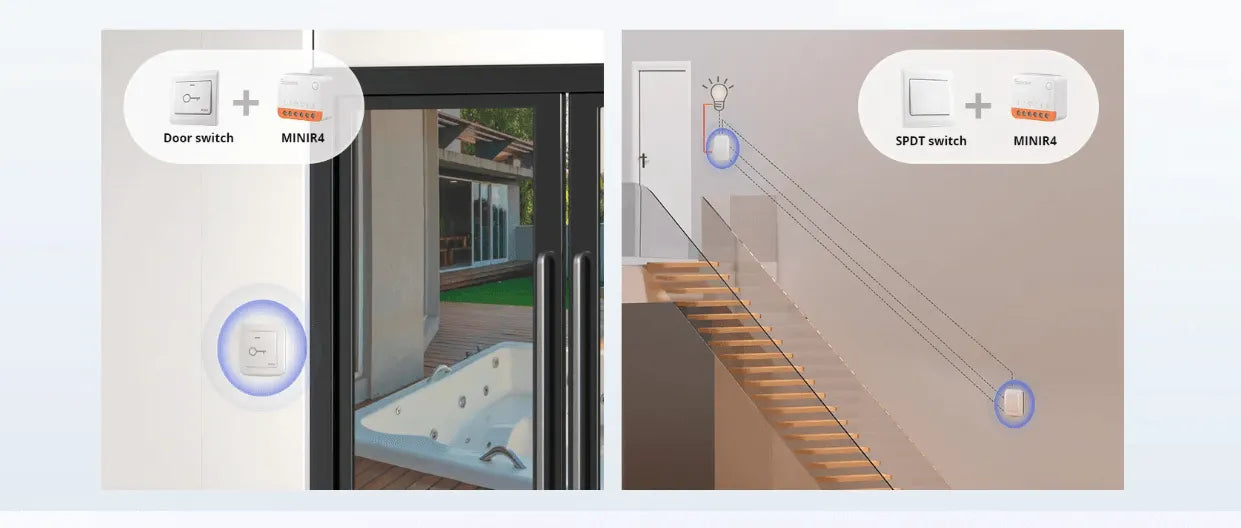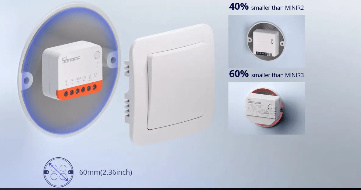 Transform any traditional switch into a wifi smart switch with the SONOFF MINIR4—a compact, versatile, and powerful solution for seamless home automation. Control your lights and devices via mobile app, wall switch, or voice assistant. No hub required.