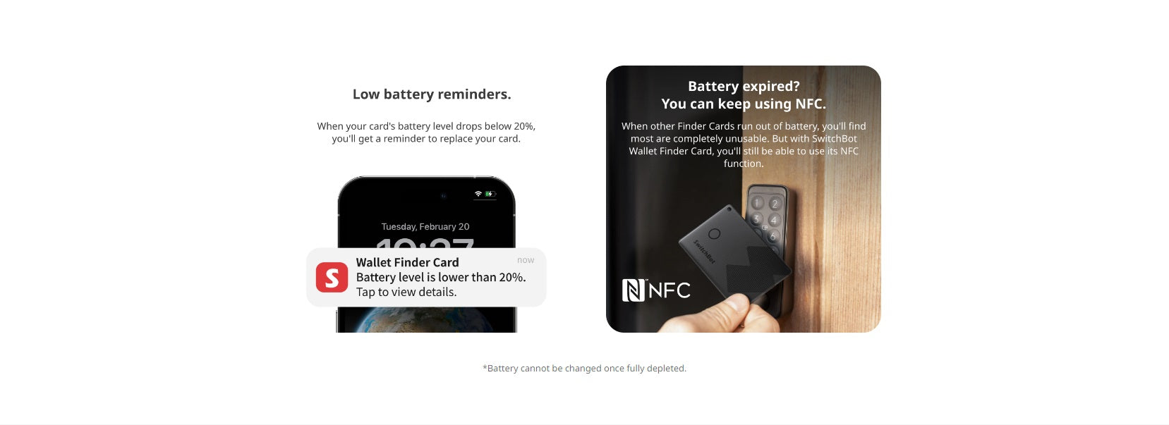 When you enable the "Find My Phone" feature in SwitchBot App, pressing the button on your Wallet Finder Card twice will make your smartphone play a sound, as long as it's within Bluetooth range. If you’ve shared the Wallet Finder Card with members in your Home, their phones will also ring if they are within Bluetooth range.